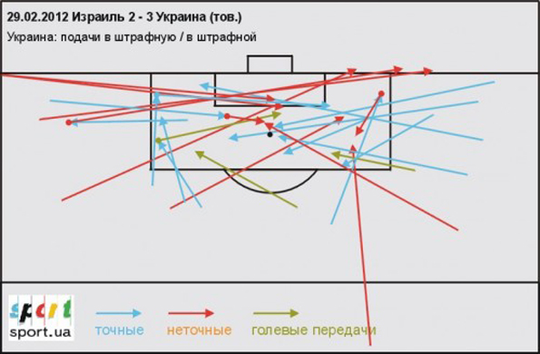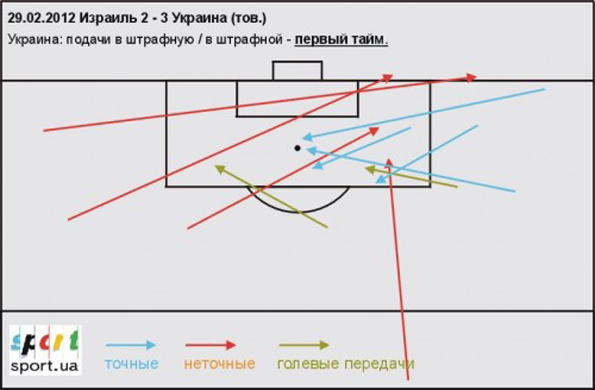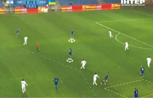 Сборная Украины хозяйничает у штрафной Израиля уже на первых минутах игры. В результате розыгрыша Гусев-Ярмоленко(за кадром)-Воронин-Девич проведена атака, мяч потерян, отобран назад и переведен на другой фланг через Ротаня на Коноплянку (белые). Первая линия защиты Израиля (синяя) без проблем пройдена.