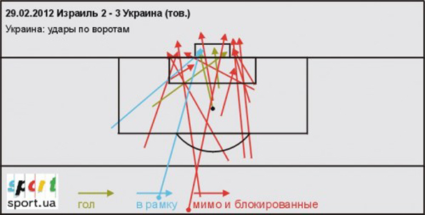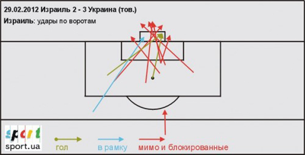 Нельзя конечно сказать, что сборная Израиля в результате лишь оборонялась - они атаковали и наносили удары по воротам (см. схему ниже). Однако первый удар с игры хозяева нанесли лишь на 19 минуте матча (сб. Украины - на 2-й). Впрочем, в створ ворот в первом тайме хозяева ни разу так и не попали, хотя имели для этого много возможностей, о которых ниже.